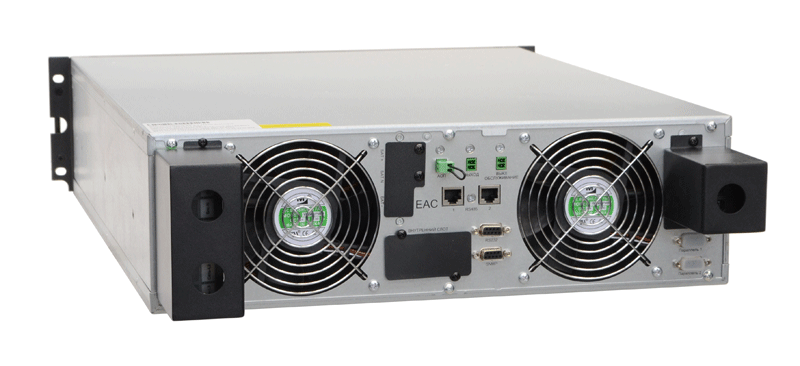 Диапазон входных напряжений устройства составляет 208–478 В (настраиваемо 380, 400, 415 В), с частотой 40–70 Гц. Коэффициент мощности входа ≥ 0,99, коэффициент нелинейных искажений не превышает 3%. Выходное напряжение стабилизируется с точностью ±1%, а форма сигнала — чистая синусоида с искажением до 2% при линейной нагрузке. КПД достигает 94% при полной нагрузке, в энергосберегающем режиме до 98%. Перегрузочная способность обеспечивает работу до 110% нагрузки в течение 60 минут, что позволяет справляться с пиковыми нагрузками без перехода на байпас. Поддерживается параллельная работа до четырех ИБП для повышения отказоустойчивости и масштабируемости системы.