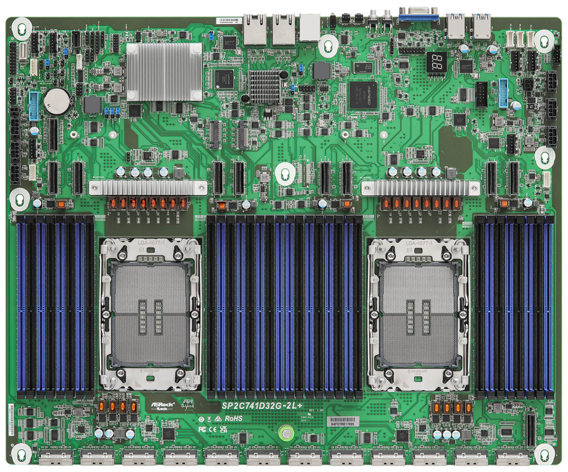 Материнская плата ASRock Rack SP2C741D32G-2L+ разработана как основа для высокопроизводительных серверных решений, нацеленных на задачи корпоративного класса и интенсивных вычислений, включая искусственный интеллект и обработку больших данных. Плата обладает проприетарным форм-фактором размером 16.93" x 13.79", поддерживает два процессорных сокета LGA4677, совместимых с Intel Xeon Scalable пятого и четвёртого поколения. Использование современных технология DDR5 с поддержкой до 16+16 DIMM слотов позволяет достичь максимального объёма оперативной памяти до 8 ТБ, обеспечивая высокую пропускную способность и надёжность благодаря ECC и RDIMM/3DS формату. PCIe 5.0 поддерживает быстрое подключение периферийных устройств и NVMe накопителей, что обеспечивает отличные показатели скорости ввода-вывода в серверных приложениях.