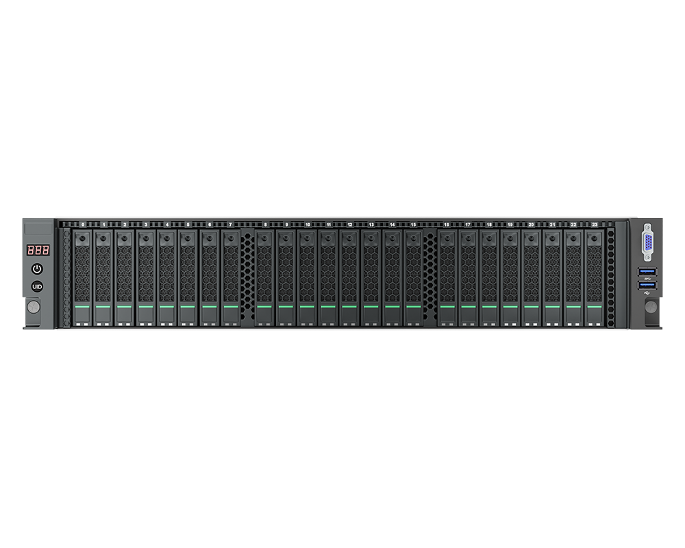 Сервер поддерживает до 28 накопителей, включая 24 фронтальных и дополнительные в тыльной части, с интерфейсами SATA/SAS для экономичного хранения и NVMe — для высокой скорости доступа к данным. Также доступна поддержка горячей замены.