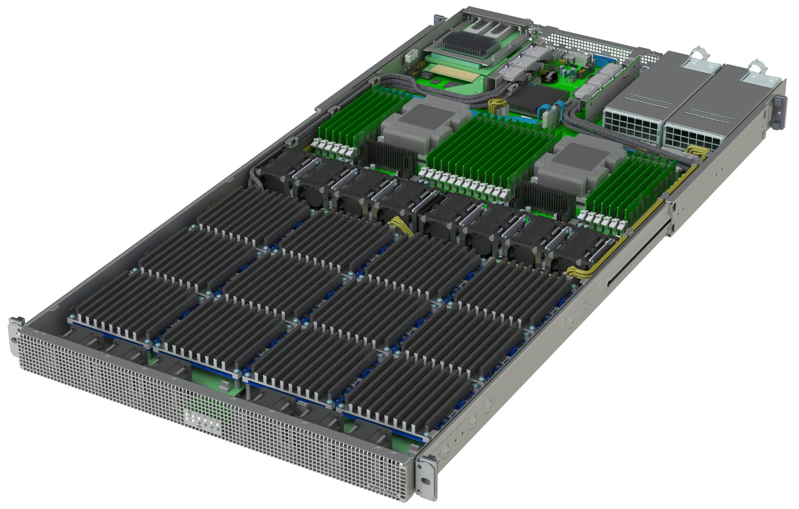 Сервер поддерживает до 24 модулей DDR4 оперативной памяти, с максимальным общим объёмом 3 ТБ, что позволяет эффективно обрабатывать большие объемы данных. Для хранения данных предусмотрены два M.2 SATA SSD для системы и два NVMe PCIe 4x диска для высокопроизводительного кеша. Оборудование оснащено одним слотом OCP 3.0 PCIe x16 и комплектуется двумя CRPS блоками питания по 1200 Вт с возможностью выбора напряжения: 220 В или 48 В. Монтажный размер составляет 1U, а габариты — 43,5×438×917 мм, что облегчает интеграцию в дата-центры.