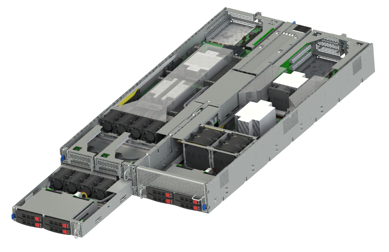 Модуль использует чипсет Intel C741 и поддерживает два процессора с TDP до 205 Вт. Для расширения имеются один слот OCP 3.0 PCIe Gen5 x16 и три Low Profile PCIe Gen5 (один x16, два x8), что позволяет подключать высокопроизводительные сетевые адаптеры и ускорители вычислений. Для хранения данных предусмотрено до 4 отсеков SFF с интерфейсами NVMe PCIe Gen4 x4, SATA и SAS, а также два системных M.2 накопителя. Применена эффективная система воздушного охлаждения, обеспечивающая стабильную работу модуля в интенсивных режимах.