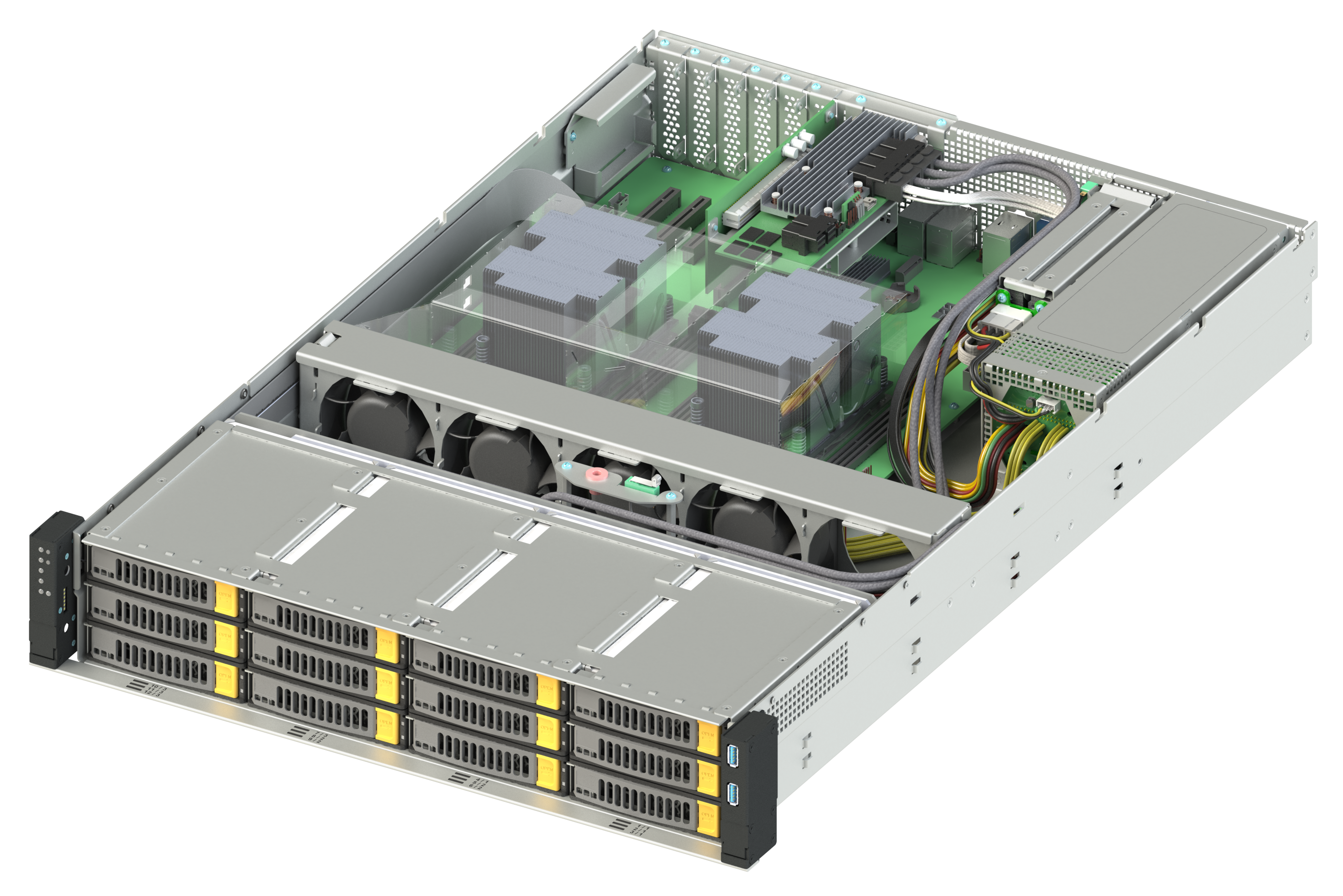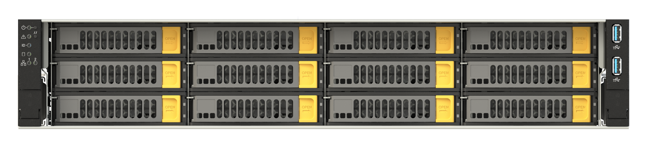 До 12 горячезаменяемых дисков 3.5" SAS/SATA формата LFF установлены в передней кассете для организации масштабируемых и надёжных RAID-массивов. На задней панели предусмотрено место для 2 2.5" SATA накопителей SFF. Сервер поддерживает диски SAS 6/12G и SSD SAS 12G для обеспечения требуемой скорости и надежности работы.