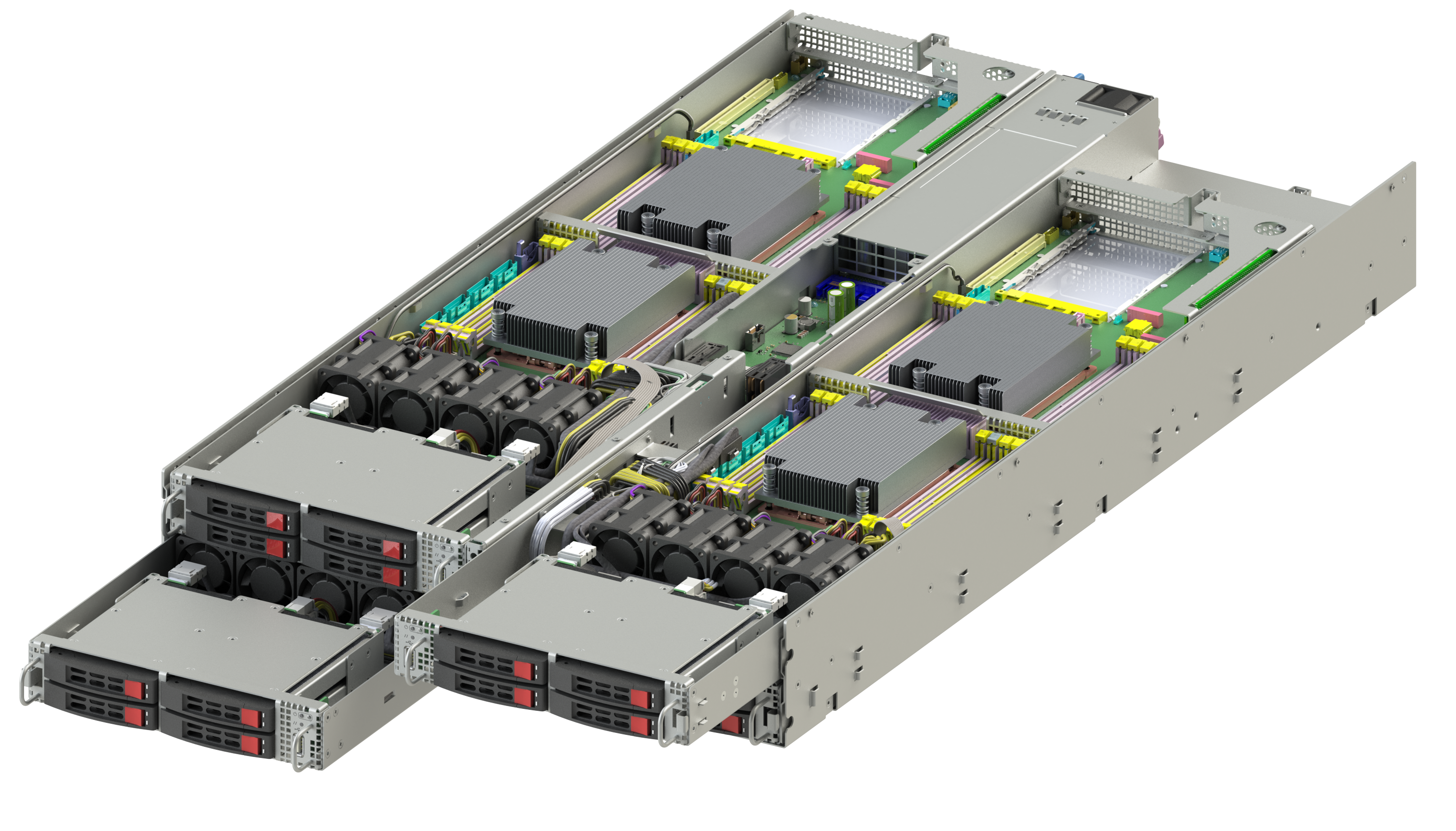 Сервер оборудован четырьмя вычислительными модулями, суммарно поддерживающими до 256 ядер процессоров и до 64 модулей DDR4 памяти, что обеспечивает масштабируемость и высокую плотность вычислений. Для расширения системы предусмотрены слоты PCIe 3.0 OCP Gen4 x16 и PCIe 16x LP для установки карт расширения, а также возможность установки двух карт M.2 в каждом модуле. Электропитание реализовано с помощью двух блоков по 3000 Вт с резервированием 1+1 для надежной работы в высоконагруженных условиях.