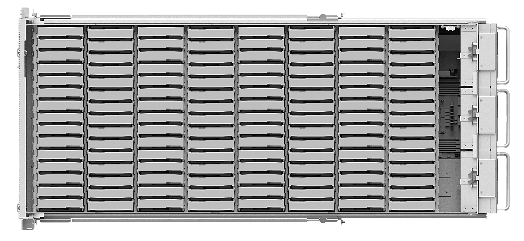 Память системы хранения реализована с помощью 8 дисков 3.5” SAS/SATA на передней панели и 120 дисков в расширительных внутренних корзинах, поддерживающих SAS 6/12G и SSD SAS 12G. Сервер позволяет использовать массивы RAID различных уровней для защиты данных и повышения производительности. Все диски являются горячезаменяемыми для удобства техобслуживания и минимизации времени простоя.