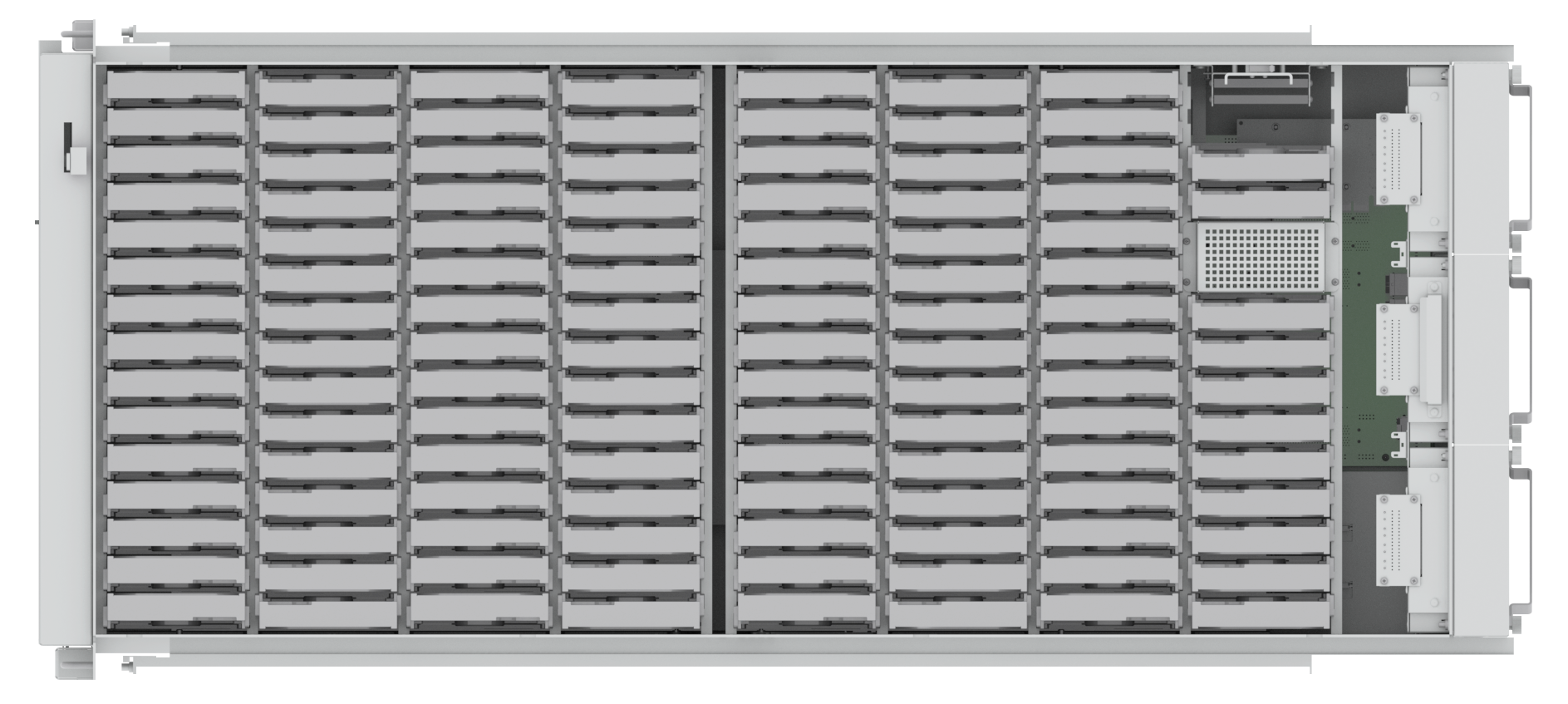 Сервер НОРСИ-ТРАНС Яхонт-УВМ Э124 представляет собой высокотехнологичное российское решение для сверхплотного хранения данных, разработанное с применением процессоров Эльбрус и отечественных компонентов. Корпус сервера рассчитан на установку до 124 жёстких дисков 3.5” SAS/SATA с возможностью горячей замены, что позволяет создать массивы хранения большой ёмкости и высокой скорости работы. Сервер оснащён собственными технологиями снижения вибрации и тепловыделения, обеспечивающими надёжность и долговременную эксплуатацию оборудования в сложных условиях. Удобная конструкция обеспечивает быстрый доступ к дискам и лёгкость их замены.