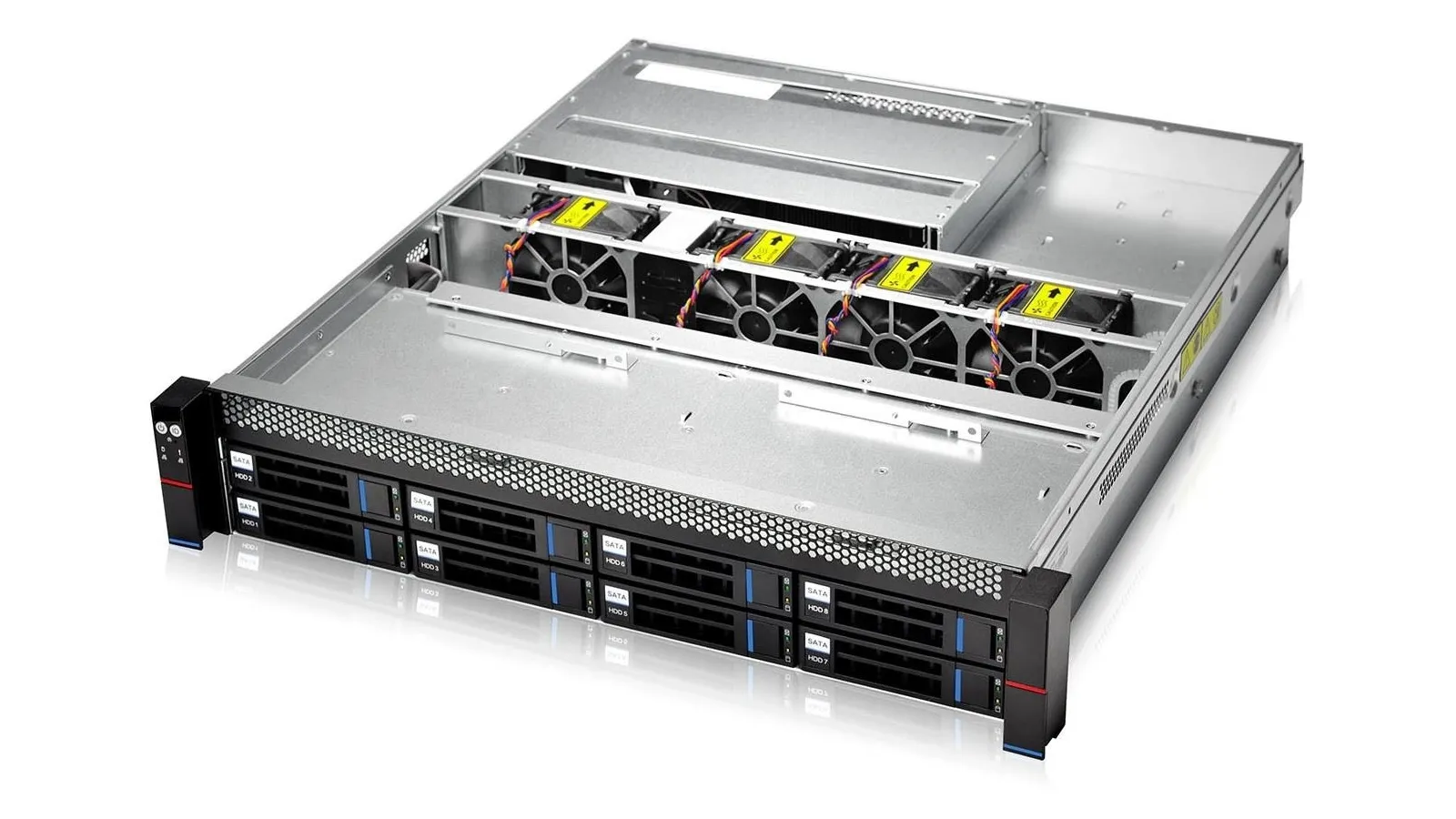 Платформа оборудована восемью фронтальными отсеками для жёстких дисков или SSD форматов 3,5” и 2,5” SATA/SAS 3.0 с поддержкой горячей замены, а также дополнительными внутренними слотами для двух 2,5” накопителей. Для защиты данных и повышения производительности в сервере предусмотрена поддержка программного RAID уровней 0, 1 и 10 с помощью адаптера LSI 3008. В сетевой подсистеме присутствуют четыре порта Gigabit Ethernet Intel i210, обеспечивающие быстрый и стабильный обмен данными. Для расширения возможностей предусмотрены два слота PCIe x8 и слот M.2 SATA SSD, что позволяет подключать дополнительные устройства и ускорять работу сервера. Система управления и мониторинга реализована через IPMI 2.0, что обеспечивает удобное и эффективное удалённое администрирование.
