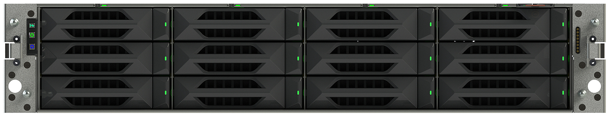 Сервер поддерживает установку до 16 накопителей формата LFF (SAS/SATA), что обеспечивает до 256 ТБ общей ёмкости (до 128 ТБ на каждый юнит в 2U-шасси). Дополнительно возможно подключение до 4 SSD-накопителей 2,5" SATA/NVMe и 2 модулей SSD M.2 для загрузочной среды.