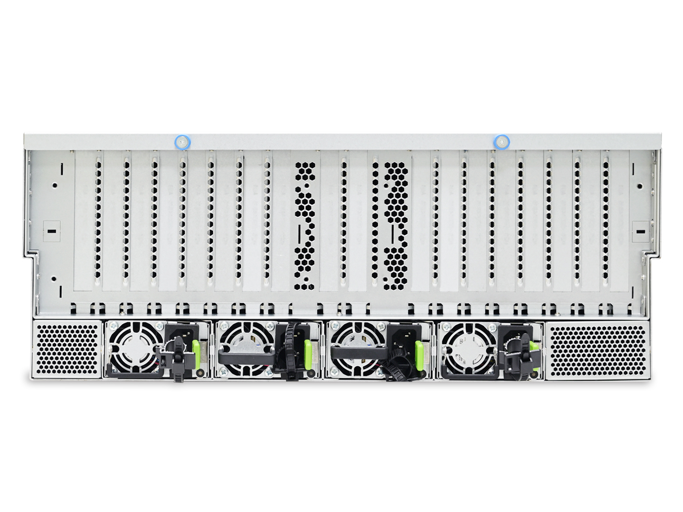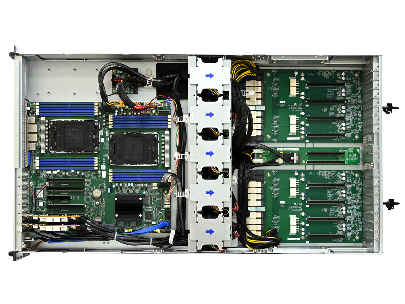 Для надёжной и бесперебойной работы сервер оснащён системой питания 2000 Вт в конфигурации 3+1, что гарантирует стабильную работу даже при выходе одного блока из строя. Сертификат Platinum обеспечивает высокую энергоэффективность, что особенно важно в условиях круглосуточной эксплуатации. Система охлаждения включает девять горячезаменяемых вентиляторов формата 8056, обеспечивающих эффективный воздушный поток через всю систему, и два активных радиатора, рассчитанных на процессоры с тепловыделением до 250 Вт. Это позволяет поддерживать стабильную работу всех компонентов даже при полной загрузке GPU и CPU.