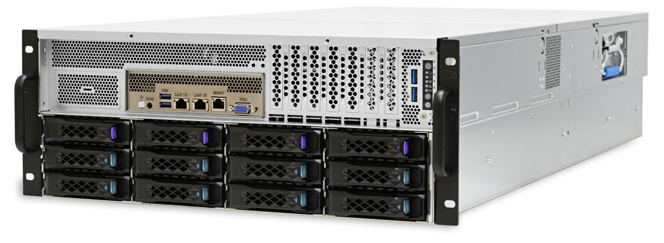 CB401-VA предлагает продуманную систему хранения и расширения, адаптированную под нужды гибридных ИИ-платформ. В сервере реализована поддержка 12 отсеков с возможностью горячей замены: четыре универсальных отсека подходят как для NVMe, так и для SAS/SATA-накопителей, а восемь предназначены для дисков SAS/SATA. Это даёт возможность сочетать высокоскоростные SSD и объёмные HDD в одной системе, обеспечивая оптимальный баланс между производительностью и ёмкостью.