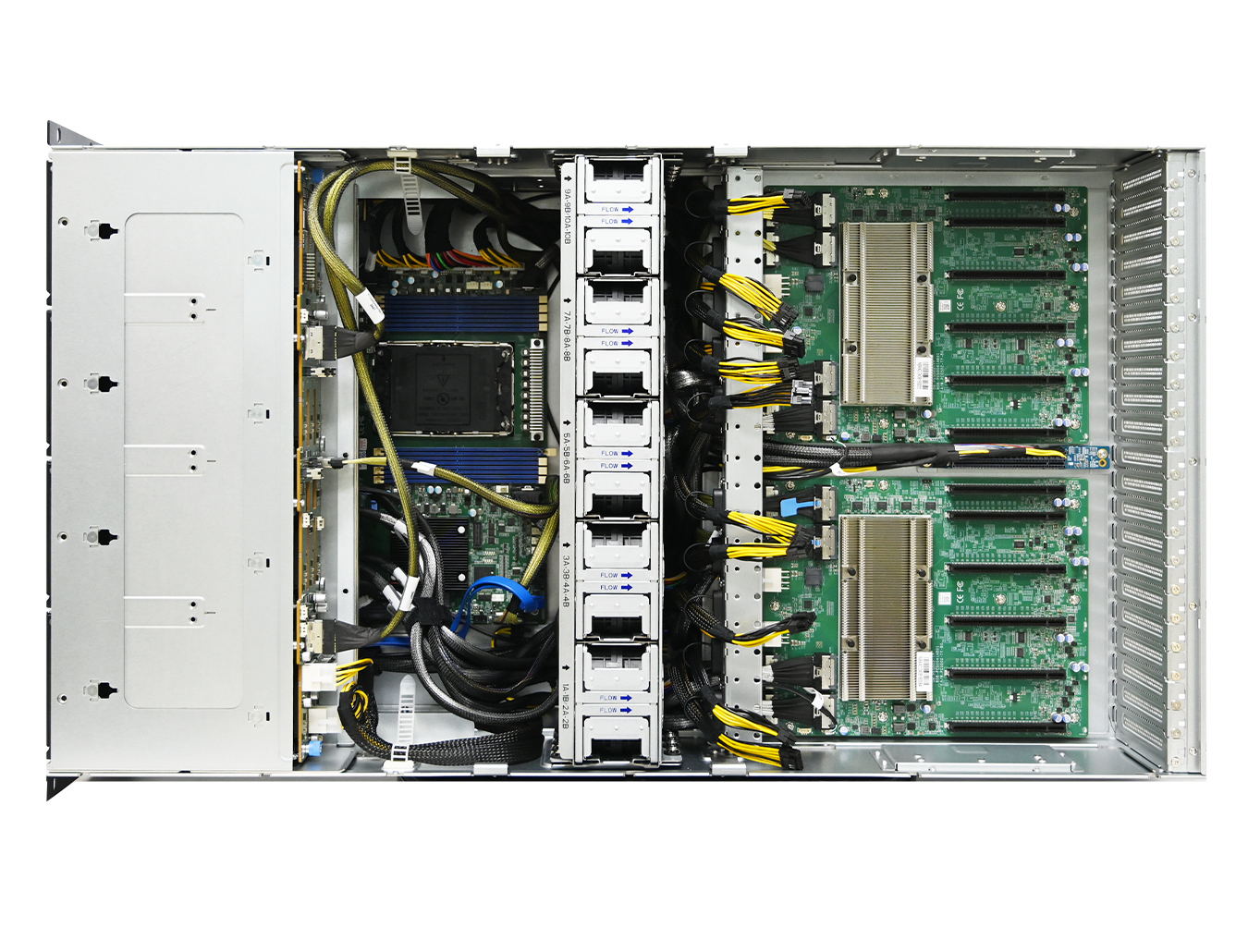 CB501-VA сочетает высокую плотность графических ускорителей с гибкой конфигурацией хранилища и ввода-вывода. Он оснащён 12 горячезаменяемыми отсеками: 4 NVMe Gen4 и 8 SAS/SATA с универсальными лотками под 3.5" или 2.5" диски. Для ускоренного доступа предусмотрены два дополнительных NVMe Gen5 2.5" на передней панели. Архитектура сервера предусматривает прямое подключение GPU к CPU по линиям PCIe Gen5 через ретаймеры, что позволяет сохранять высокую пропускную способность и минимальные задержки.