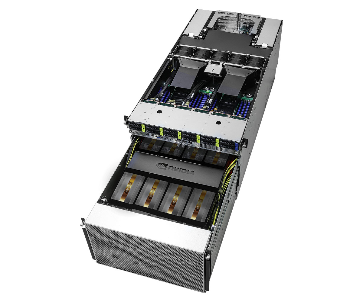 Форм-фактор 8U предоставляет баланс между компактностью и возможностью размещения производительных компонентов. Сервер оборудован 16+16 слотами для DDR5 RDIMM/3DS памяти, поддерживающими до 8 ТБ объёма. Для хранения данных предусмотрено до 12 горячезаменяемых NVMe-накопителей формата 2,5", что обеспечивает высокую скорость доступа благодаря PCIe 5.0. Для подключения видеокарт используется интегрированный PCIe switch, который оптимизирует передачу данных между GPU и CPU, а также сетевые интерфейсы обеспечивают технологию GPUDirect RDMA для минимизации задержек в сетевых вычислениях.