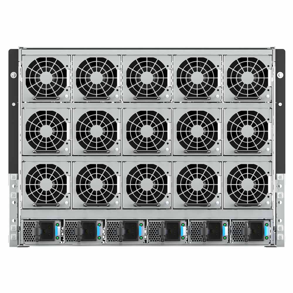 MiTAC G8825Z5 (G8825Z5U2BC) спроектирован с учётом масштабируемости и долговечности. Форм-фактор 8U позволяет разместить сервер в стойке с высокой плотностью и оптимизированным воздушным потоком. Система охлаждения включает 15 горячезаменяемых вентиляторов, что обеспечивает стабильную работу даже при максимальной нагрузке. Четыре блока питания мощностью 3300 Вт с сертификатом 80+ Titanium и резервирование компонентов делают сервер надёжным и эффективным решением для критически важных приложений в крупных ИТ-инфраструктурах.