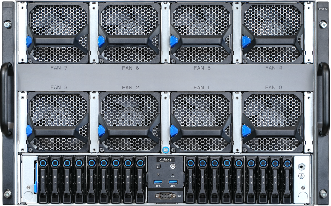 Сервер Quanta QCT QuantaGrid D75F-7U/S8F — высокопроизводительная вычислительная платформа форм-фактора 7U с двумя процессорами Intel Emerald Rapids и восемью графическими ускорителями NVIDIA HGX H200 с 141 ГБ памяти каждая. Предназначен для масштабируемых задач искусственного интеллекта, глубокого обучения и высокопроизводительных вычислений.
