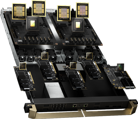 Сердцем GB200 NVL72 является суперчип NVIDIA GB200 Grace Blackwell. Он соединяет два высокопроизводительных графических процессора NVIDIA Blackwell Tensor Core и процессор NVIDIA Grace с помощью межчипового интерфейса NVLink (C2C), обеспечивающего двунаправленную пропускную способность 900 ГБ/с. Благодаря NVLink-C2C приложения имеют согласованный доступ к единому пространству памяти. Это упрощает программирование и поддерживает большие потребности в памяти для LLM с триллионом параметров, моделей преобразователей для мультимодальных задач, моделей для крупномасштабного моделирования и генеративных моделей для 3D-данных. Вычислительный лоток GB200 основан на новом дизайне NVIDIA MGX. Он содержит два процессора Grace и четыре графических процессора Blackwell. GB200 имеет холодные пластины и разъемы для жидкостного охлаждения, поддержку PCIe 6-го поколения для высокоскоростной сети и разъемы NVLink для кабельного картриджа NVLink. Вычислительный лоток GB200 обеспечивает производительность искусственного интеллекта 80 петатопс и 1,7 ТБ быстрой памяти.