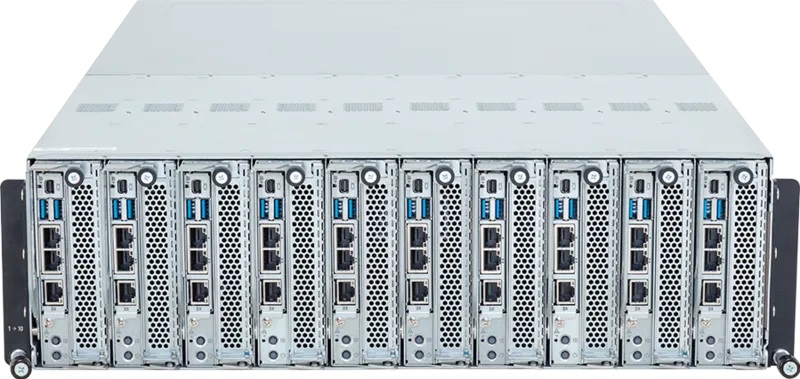 Каждый из десяти узлов сервера B343-C40 оснащен одним процессором с поддержкой до 4 слотов для DDR5 ECC UDIMM памяти, что обеспечивает высокую пропускную способность и стабильность работы. Сервер оснащен пятью слотами OCP NIC 3.0 для установки многохостовых сетевых карт, что позволяет значительно упростить сетевую инфраструктуру и повысить её эффективность. Встроенные двойные гигабитные сетевые порты обеспечивают надежное базовое сетевое подключение. Для повышения надежности сервер оснащен четырьмя блоками питания с возможностью резервирования, что гарантирует бесперебойную работу в условиях высокой нагрузки и бизнес-критичных приложениях.