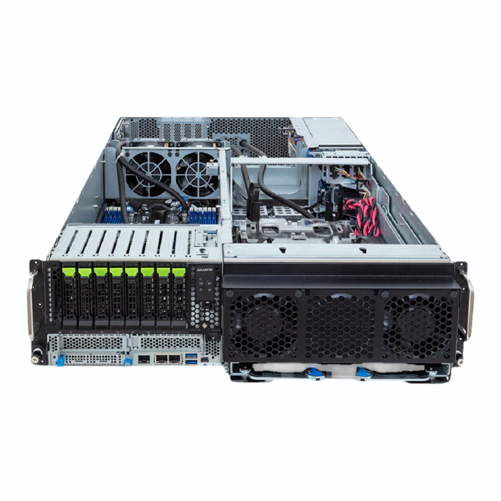 Сервер Gigabyte G363-ZR0-L оснащён четырьмя графическими ускорителями NVIDIA HGX H100 с 80 ГБ памяти каждый и двумя процессорами AMD Genoa, что обеспечивает высокую производительность и масштабируемость для задач искусственного интеллекта, научных вычислений и обработки больших данных.
