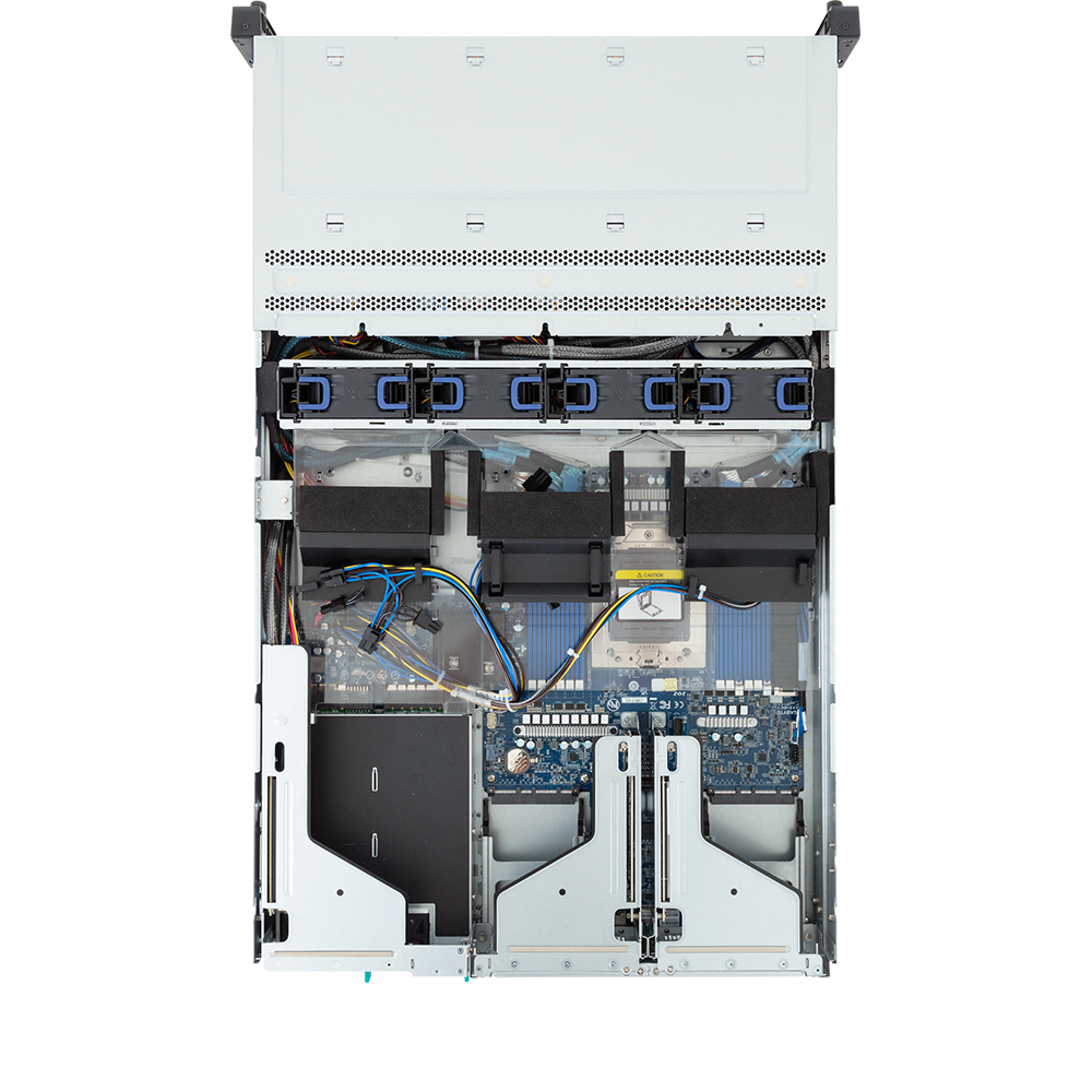 Сервер оснащён 12-канальной архитектурой памяти DDR5 с поддержкой 12 модулей RDIMM, обеспечивающей высокую пропускную способность. Для хранения данных доступны 8 горячезаменяемых отсеков с поддержкой NVMe/SATA/SAS-4 Gen5, а также 4 дополнительных отсека SATA/SAS-4. Для ускорения задач машинного обучения доступны три полноразмерных FHFL PCIe Gen5 x16 слота, дополненные M.2-слотом под быстрые накопители. Высокоскоростная сетевая интеграция обеспечивается за счёт одного гигабитного LAN-порта и двух OCP NIC Gen5 слотов.