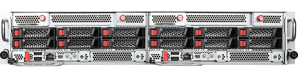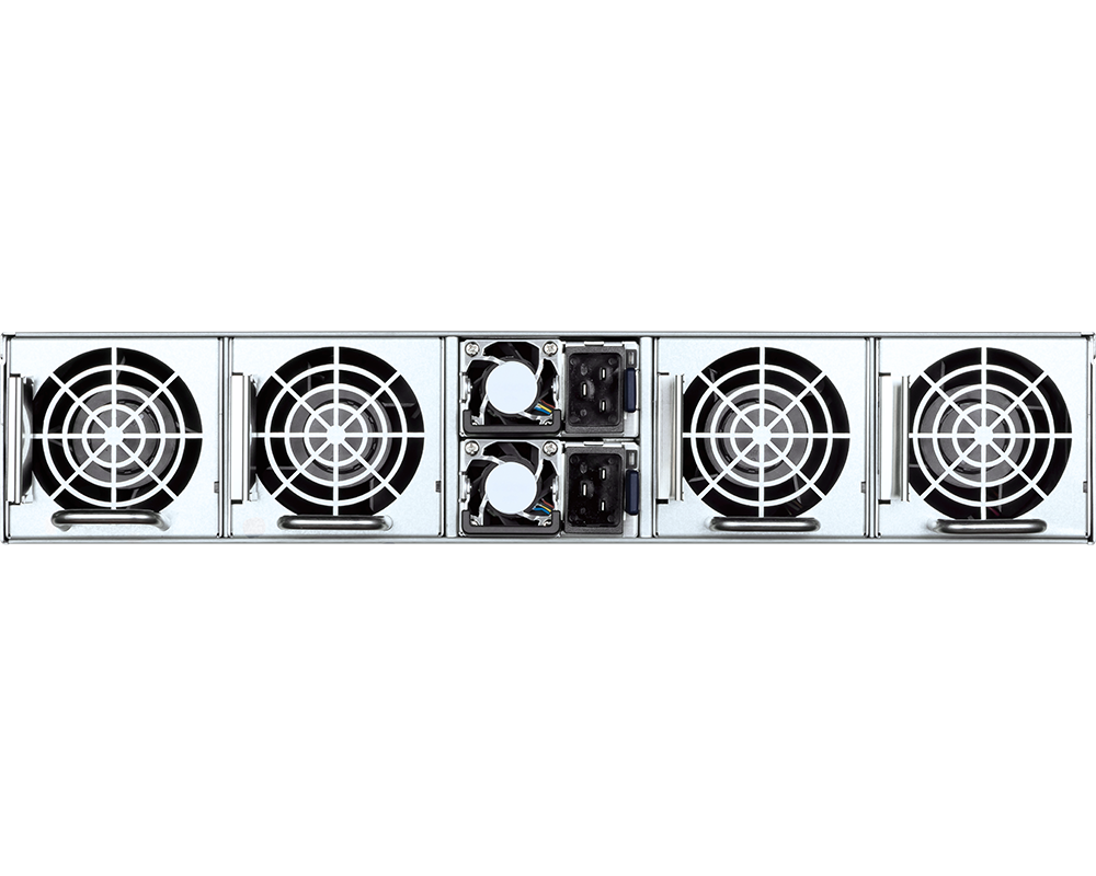 Шасси поддерживает два резервируемых блока питания мощностью до 2200 Вт (80 PLUS Platinum), обеспечивая непрерывную работу узлов даже при полном ресурсоёмком сценарии. Мощная система охлаждения включает в себя набор независимых вентиляторов с интеллектуальным управлением, адаптированным под каждый узел. Это обеспечивает оптимальное распределение тепла и предотвращает перегрев даже при плотной загрузке стойки.