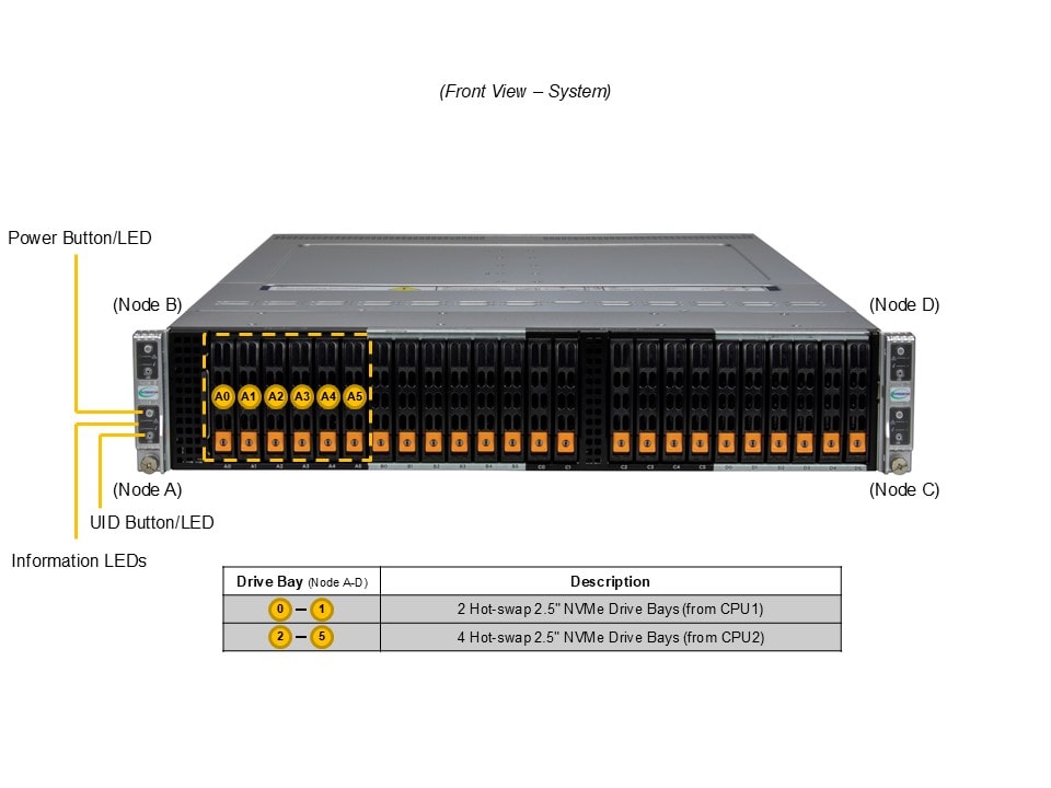 Сервер предлагает гибкие сетевые возможности, включая слот AIOM, совместимый со стандартом OCP 3.0, позволяющий интегрировать современные сетевые решения с высокой пропускной способностью. Для расширения функционала доступны до двух слотов PCIe 5.0 x16 LP и один слот PCIe 5.0 x16 AIOM для установки ускорителей, контроллеров и сетевых карт. Встроенные шесть горячезаменяемых слотов NVMe 2.5" на каждый узел обеспечивают быстрый доступ к данным и высокую скорость операций ввода-вывода.