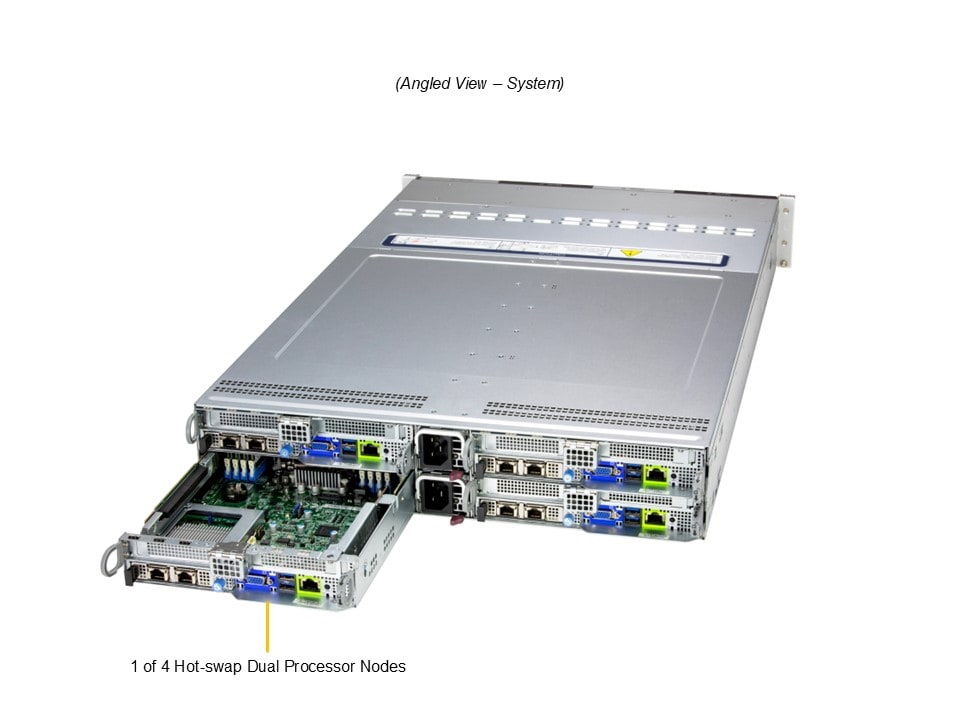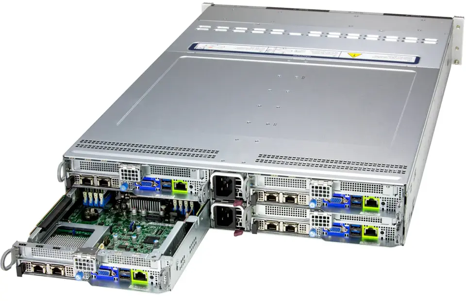 В основе каждого узла лежат два современных процессора Intel® Xeon® серий 6700 или 6500 с возможностью жидкостного охлаждения и тепловым пакетом до 350 Вт, что обеспечивает высокую вычислительную мощность и эффективность работы под нагрузкой. Сервер поддерживает до 16 слотов DIMM с модулями DDR5-6400 общей ёмкостью до 4 ТБ при конфигурации 1DPC, что позволяет быстро обрабатывать большие объёмы данных и работать с ресурсоёмкими приложениями. Высокая пропускная способность памяти и процессоров делает систему универсальным решением для интенсивных вычислительных задач и масштабируемых систем хранения.