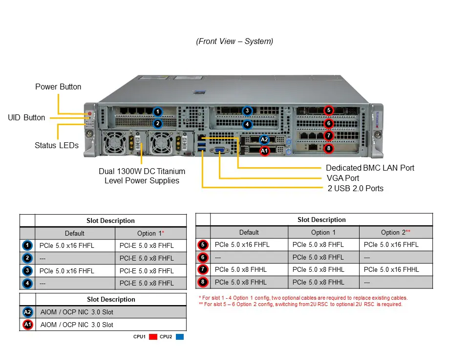 Сервер предлагает настраиваемые PCIe слоты, до 8 слотов PCIe 5.0 x8 (6 FHFL + 2 FHHL) или до 4 слотов PCIe 5.0 x16 (3 FHFL + 1 FHHL), что обеспечивает гибкость в расширении системы.