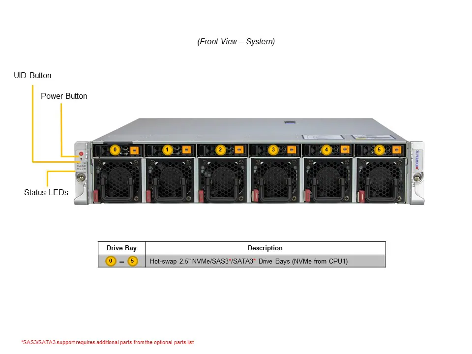 Конфигурация хранилища по умолчанию включает 6 фронтальных 2.5" NVMe/SAS/SATA дисков с горячей заменой. Вариант A добавляет 2 задних NVMe отсека, а вариант B — 4. Также доступны 2 внутренних M.2 NVMe слота форматов 2280/22110/25110 с интерфейсом PCIe 5.0 x2. Поддержка дисков может потребовать дополнительных контроллеров или кабелей.