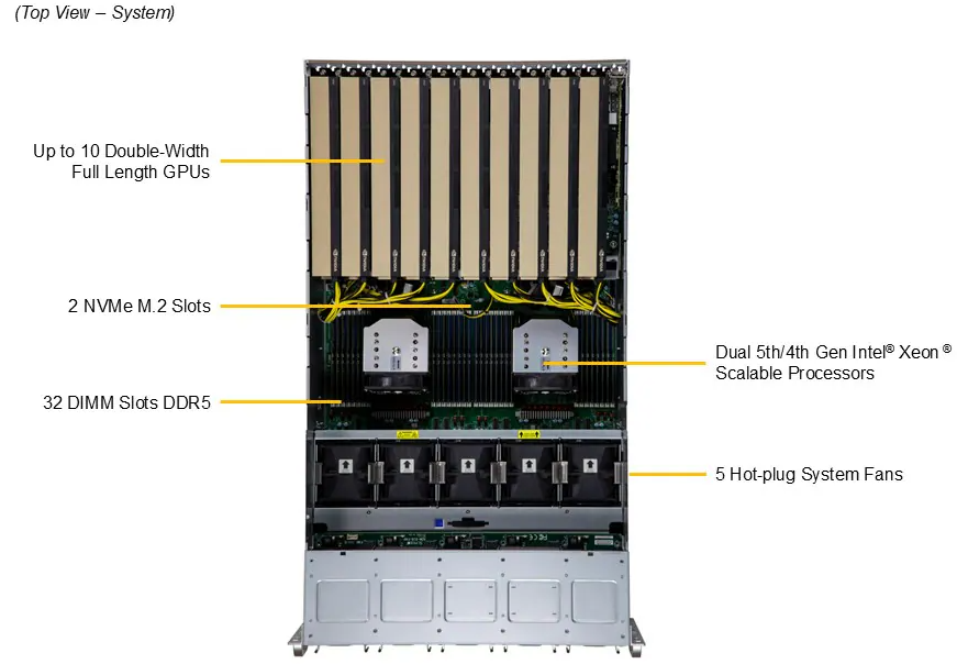 Сервер Supermicro SYS-521GE-TNRT-G1 обладает несколькими ключевыми преимуществами, которые делают его идеальным решением для высокопроизводительных вычислительных задач. Он предлагает до 13 слотов PCIe 5.0 для гибкой установки GPU, I/O и сетевых интерфейсов, что позволяет легко адаптировать систему под различные нагрузки. Его архитектура обеспечивает сбалансированное ускорение, I/O и конфигурации хранения данных, что дает максимальную гибкость. Термально оптимизированный корпус поддерживает максимальную производительность, эффективно управляя воздушным охлаждением для поддержания стабильной работы даже в условиях высокой нагрузки.