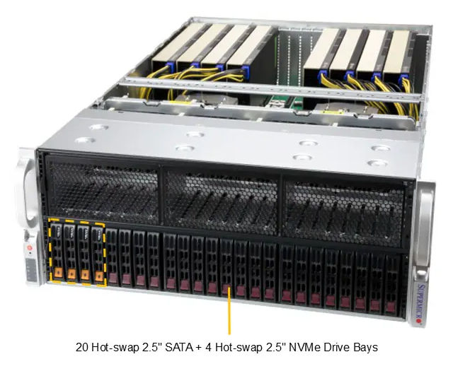 Supermicro AS-4125GS-TNRT предоставляет гибкие возможности по конфигурации хранилища — до 4 NVMe-накопителей с горячей заменой, что идеально подходит для хранения и быстрой обработки больших объёмов данных. Дополнительный слот M.2 PCIe расширяет функциональность системы, позволяя использовать его в качестве загрузочного устройства или для ускорения кэширования.
