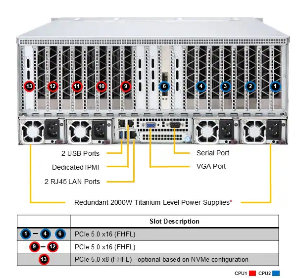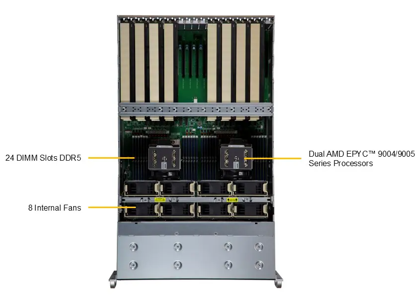 Уникальной особенностью сервера является возможность установки до восьми графических карт полной длины и двойной ширины с прямым подключением к PCIe. Это позволяет достигать максимальной пропускной способности между CPU и GPU, снижая задержки и обеспечивая стабильную производительность в сценариях ИИ и HPC (высокопроизводительных вычислений).