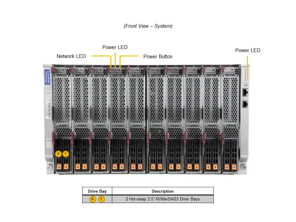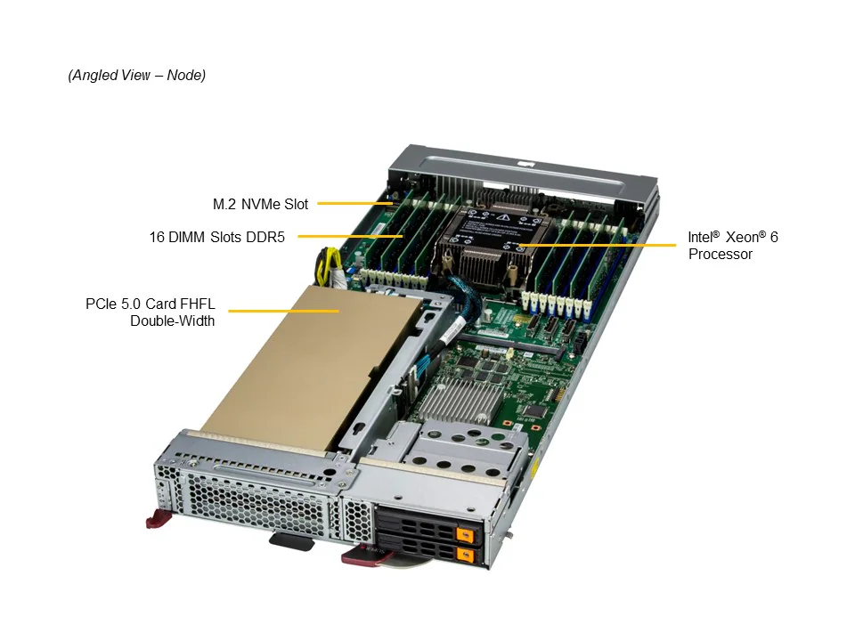 Supermicro Blade SBI-612B-1C2N — это сервер с одним сокетом E2 (LGA-4710), поддерживающий процессоры Intel® Xeon® 6700/6500 серии с P- или E-ядрами. Он предлагает до 4 ТБ памяти DDR5ECC RDIMM/3DS-RDIMM с частотой до 6400MT/s и до 16 слотов DIMM. Сервер оснащен поддержкой двух горячих заменяемых U.2 NVMe/SAS дисков и поддерживает HW RAID 0 и 1 через контроллер Broadcom 3108. Также присутствуют два порта 25G Ethernet (LOM) и слот для дополнительной карты Ethernet mezzanine.