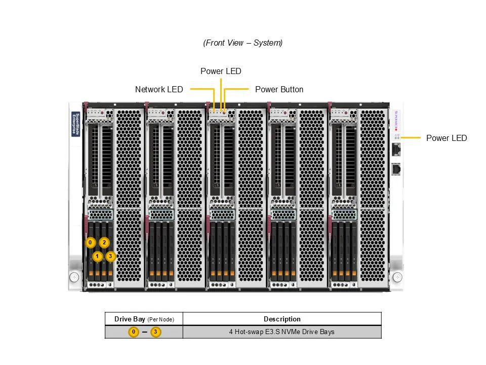 Сервер оснащен одним сокетом для процессоров Intel® Xeon® 6900 серии и поддерживает до 12 DIMM-слотов, обеспечивающих до 3 ТБ DDR5 RDIMM или 1,5 ТБ DDR5 MRDIMM для работы с большими объемами данных. Он также поддерживает 4 горячезаменяемых SSD-накопителей E3.S NVMe и 2 M.2 NVMe, обеспечивая быстрый доступ к данным. Встроенные интерфейсы Ethernet с пропускной способностью 25G и слоты для расширений позволяют гибко настраивать сетевые возможности сервера для различных сценариев применения.