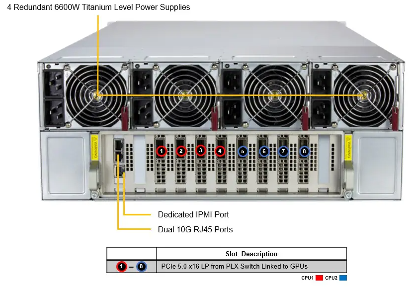 Для хранения данных сервер предлагает до 8 передних горячезаменяемых слотов для NVMe накопителей формата 2.5", что обеспечивает быстрый доступ к данным и простоту обслуживания без простоев. Система оснащена четырьмя избыточными блоками питания мощностью 6600 Вт с сертификатом эффективности Titanium, что гарантирует бесперебойную работу даже при повышенной нагрузке и критичных задачах. Наличие двух 10GbE портов RJ45 обеспечивает высокоскоростное сетевое подключение и интеграцию в современные дата-центры.