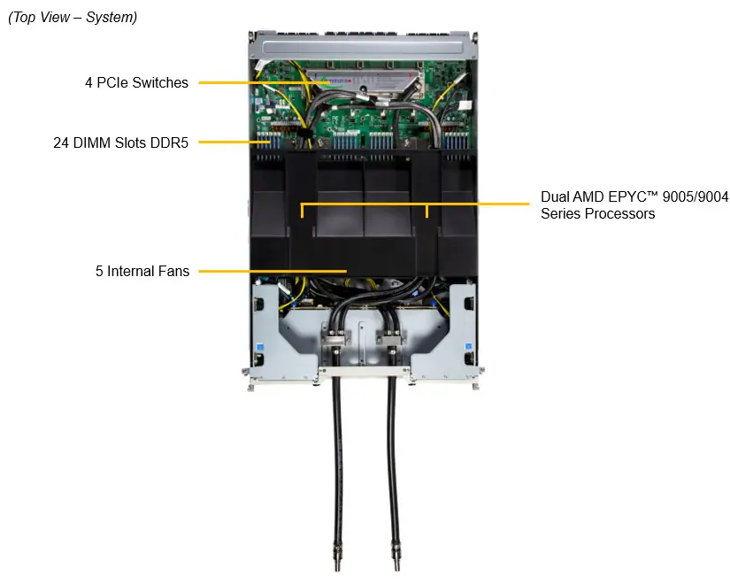 Сервер AS-4126GS-NMR-LCC оборудован двумя мощными процессорами AMD EPYC серии 9005/9004 с тепловым пакетом до 500 Вт, охлаждаемыми жидкостной системой, что позволяет эффективно справляться с интенсивными вычислительными нагрузками. Поддержка до 24 слотов DIMM с DDR5-6400 и максимальным объёмом памяти до 9 ТБ в конфигурации 1DPC гарантирует высокую пропускную способность и достаточные ресурсы для многозадачности и обработки больших массивов данных. Встроенные высокоскоростные интерфейсы PCIe 5.0 с 8 слотами x16 LP и 2 слотами x16 FHHL обеспечивают гибкость и масштабируемость для подключения современных ускорителей и сетевого оборудования.