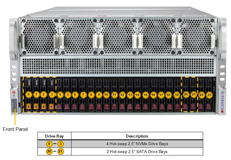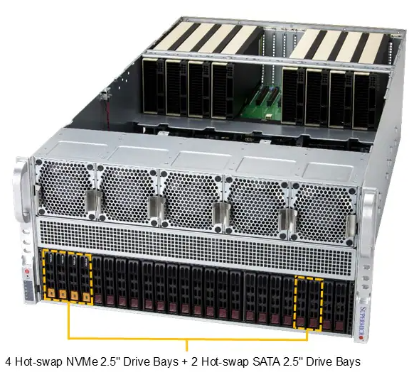 Сервер оборудован 24 слотами DIMM, которые поддерживают до 9 ТБ оперативной памяти DDR5-6400 с конфигурацией 1DPC, что обеспечивает высокую пропускную способность и низкую задержку при обработке больших массивов данных. Наличие до 9 слотов PCIe 5.0 x16 FHFL позволяет гибко наращивать вычислительные ресурсы и интегрировать современные ускорители и контроллеры. Для удобства и высокой скорости работы с данными предусмотрены 2 фронтальных горячих слота для SATA-дисков 2,5 дюйма и 4 слота для NVMe-дисков 2,5 дюйма, что обеспечивает оптимальное сочетание ёмкости и быстродействия хранения.