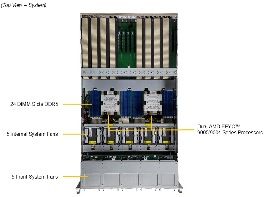 Сервер Supermicro GPU A+ Server AS-5126GS-TNRT представляет собой мощную и высокоэффективную платформу, разработанную для удовлетворения требований самых требовательных вычислительных задач современного мира. Оснащённый двумя процессорами AMD EPYC™ серии 9005, способными работать с тепловыделением до 500 Вт, этот сервер обеспечивает выдающуюся производительность и масштабируемость. В сочетании с поддержкой до восьми двойных PCIe GPU ускорителей, система позволяет эффективно справляться с интенсивными нагрузками в сферах искусственного интеллекта, машинного обучения и 3D-визуализации.