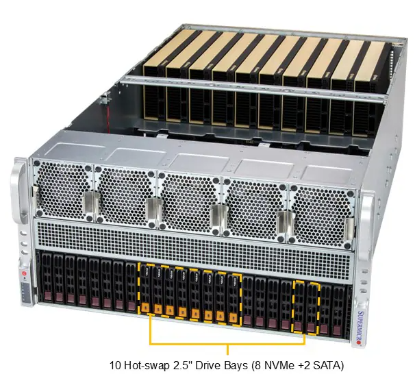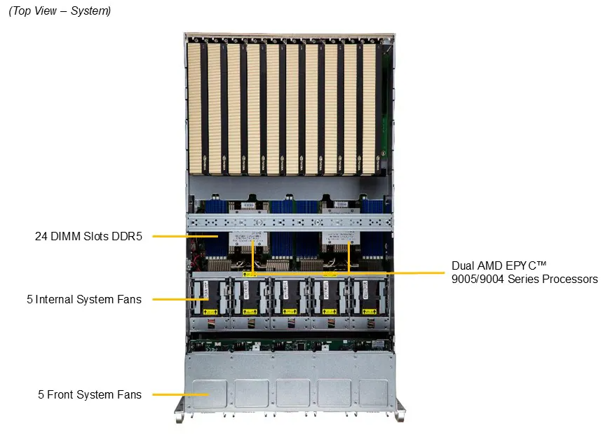 Сервер Supermicro GPU A+ Server AS-5126GS-TNRT2 — это высокопроизводительная система, специально созданная для решения самых требовательных вычислительных задач, включая искусственный интеллект, глубокое обучение и высокопроизводительные вычисления (HPC). Оснащённый двумя мощными процессорами AMD EPYC™ серии 9005 с тепловыделением до 500 Вт, сервер обеспечивает превосходную производительность и масштабируемость. Благодаря поддержке до 10 графических ускорителей двойной ширины через переключатель PLX, система отлично подходит для задач 3D рендеринга, визуализации, сложных симуляций и создания мультимедийного контента.