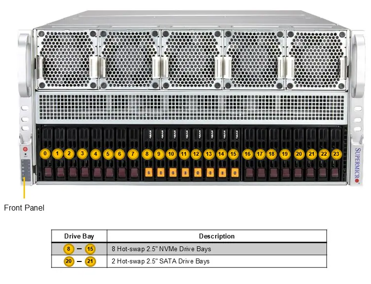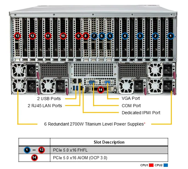 Важной особенностью данной платформы является поддержка до 24 слотов DIMM с памятью DDR5-6400, что позволяет устанавливать до 9 ТБ оперативной памяти в конфигурации 1DPC. Это даёт возможность эффективно обрабатывать огромные объёмы данных и обеспечивает быструю работу приложений с интенсивными вычислительными нагрузками. Гибкость подключения расширяется благодаря поддержке AIOM и широкому набору слотов PCIe: до 13 PCIe 5.0 x16 FHFL слотов, что позволяет легко масштабировать систему и интегрировать современные компоненты.