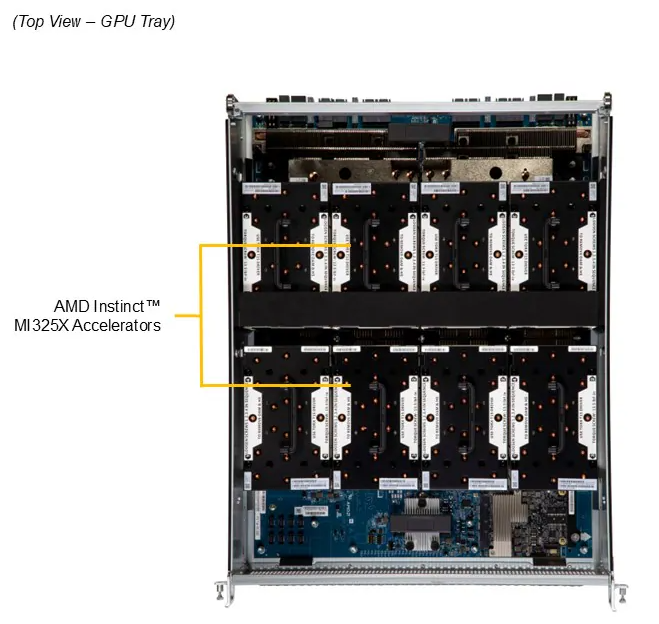 Основу сервера составляют два процессора AMD EPYC™ серий 9005/9004 с тепловыделением до 500 Вт и воздушным охлаждением, обеспечивающие высокую вычислительную мощность и энергоэффективность. Сервер оснащен восемью графическими ускорителями AMD Instinct™ MI325X в формате OAM, что позволяет эффективно обрабатывать задачи машинного обучения и анализа больших объемов данных. Использование новейших стандартов PCIe 5.0 гарантирует высокую пропускную способность для взаимодействия между компонентами, а быстрые NVMe накопители обеспечивают минимальные задержки при работе с данными. Жидкостное охлаждение, применяемое в системе, поддерживает стабильную работу под нагрузкой, предотвращая перегрев и обеспечивая надежность даже в условиях длительных интенсивных вычислений.