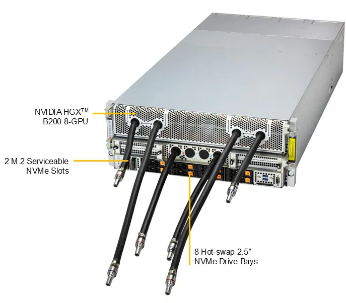 Сервер Supermicro GPU SuperServer SYS-421GE-NBRT-LCC — это высокопроизводительное решение в форм-факторе 4U с жидкостным охлаждением, специально разработанное для самых требовательных вычислительных задач. Эта система отлично подходит для научных исследований, искусственного интеллекта, глубокого обучения, а также работы с большими языковыми моделями (LLM). Благодаря поддержке до восьми графических ускорителей NVIDIA HGX B200 с общим объёмом видеопамяти 1,4 ТБ, сервер обеспечивает исключительную вычислительную мощность и высокую пропускную способность памяти, что критично для современных вычислительных нагрузок и приложений.