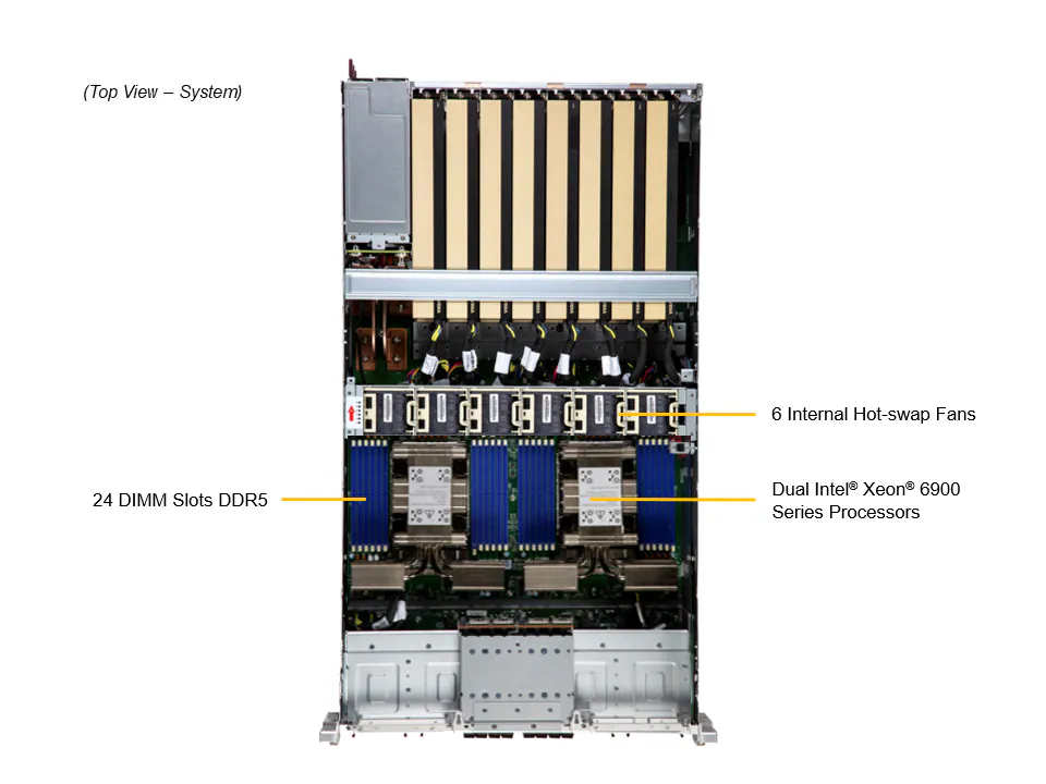 SuperServer SYS-322GA-NR использует процессоры Intel® Xeon® 6900 серии с поддержкой P-ядр. Эти процессоры обладают высокой вычислительной мощностью, обеспечивая до 128 ядер и 256 потоков с кэш-памятью до 504MB на каждый процессор. Это позволяет обрабатывать самые требовательные вычислительные задачи и значительно повышает производительность при многозадачной обработке и анализе данных.