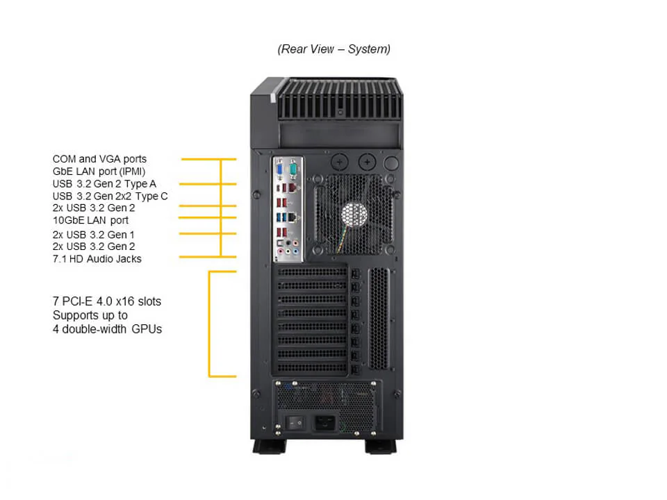 Рабочая станция поддерживает до 1 ТБ оперативной памяти DDR4 ECC, что позволяет решать задачи с высокими требованиями к памяти. Сетевые возможности включают порты 10GbE RJ45 и 1 USB 3.2 Gen2 Type-C, обеспечивая стабильную работу при высокой пропускной способности. Также имеется поддержка до 4 графических процессоров для параллельных вычислений, таких как 3D-рендеринг, моделирование и обучение нейросетей, с возможностью установки самых мощных графических карт NVIDIA и AMD. Для хранения данных предусмотрены M.2 и SATA NVMe слоты с возможностью горячей замены, что гарантирует быструю загрузку и обработку информации.