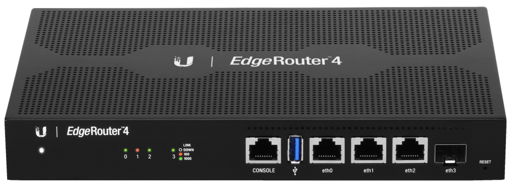 Fanless router with a four-core, 1 GHz MIPS64 processor, (3) Gigabit RJ45 ports, and an SFP port.