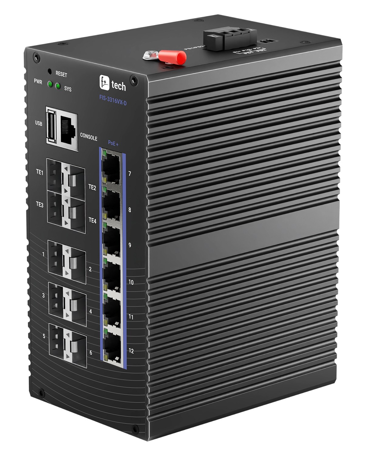 Fplus FIS-3316VX-D — надежный и производительный промышленный коммутатор, предназначенный для эксплуатации в сложных климатических и механических условиях при сохранении высокой функциональности и безопасности сети.