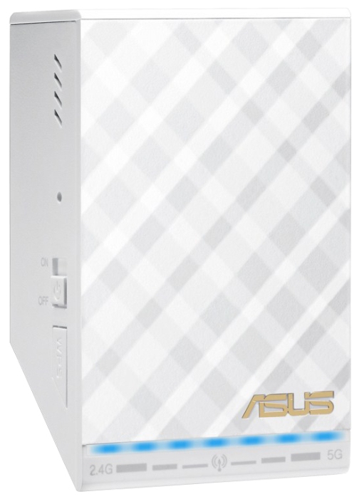 An LED signal-strength meter on the front of the RP-AC52 wireless range extender shows at a glance the strength of both the 2.4 GHz and 5 GHz signals.