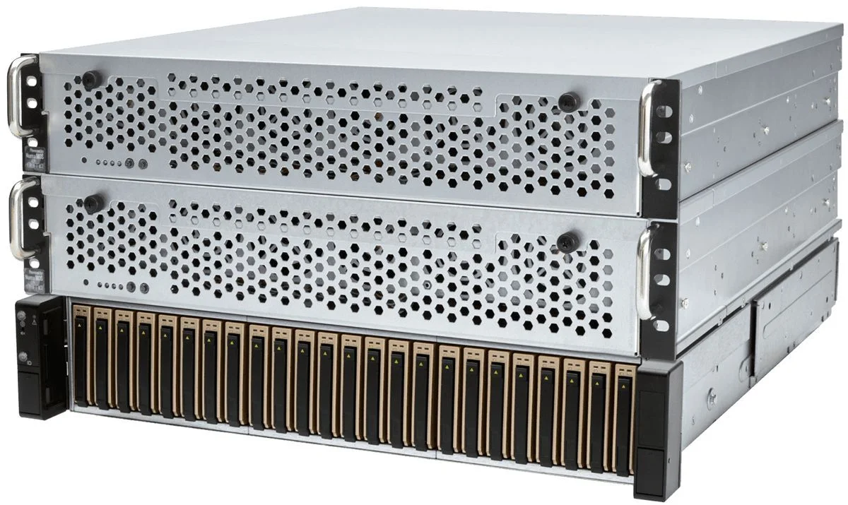 Каждый контроллер оснащен двумя процессорами семейства Xeon Scalable 3-го поколения с термопакетом до 160Вт и количеством ядер до 56 на CPU. Контроллеры объединены двойным активным подключением (25GbE и 100GbE), обеспечивающим высокую скорость синхронизации и отказоустойчивость между узлами кластера.